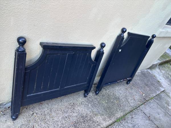 Twin bed frame in black wood to give away. Comes with all the rest of the full bed (not pictured).