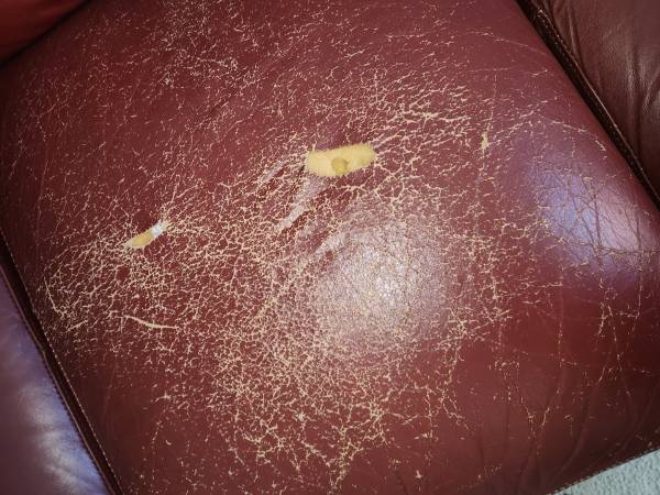 Has a tear in the coushin. Needs to be patched or replaced. Super comfy couch. You could sleep on it it's soo comfortable. Very nice besides the work coushin. See pics. Must pick up asap