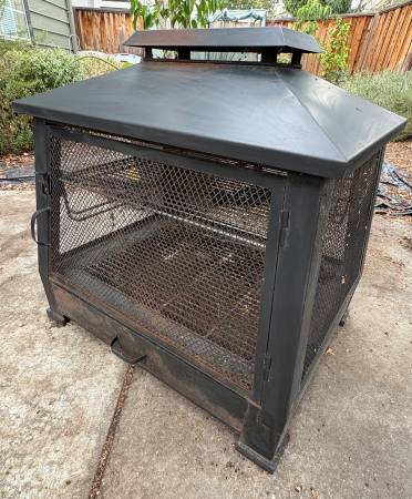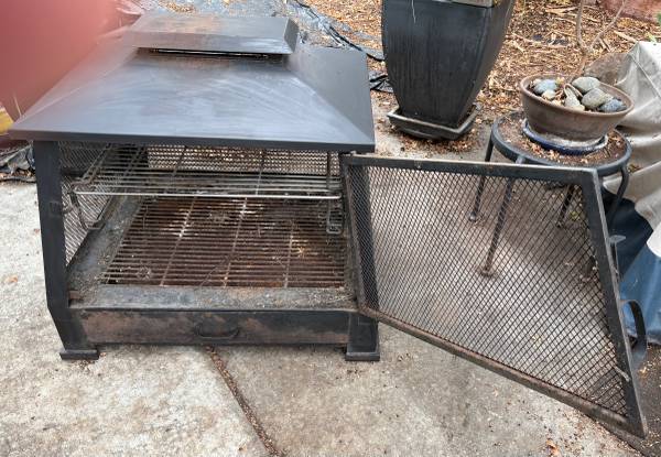 Free heavy-duty fire-pit with hinged door and latch, and drawer to catch ashes for easier removal. Includes adjustable rack. 33” wide x 26.5” deep x 31” high I don’t have the weight of the item, but...