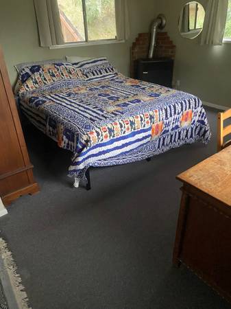 High ceilings . Open floor plan Lots of sun. Feels like a tree house. Private and Quiet. Short walk to town. Month to month agreement Full kitchen. Shower no bath tub.