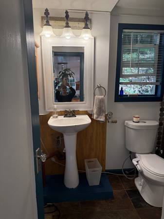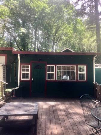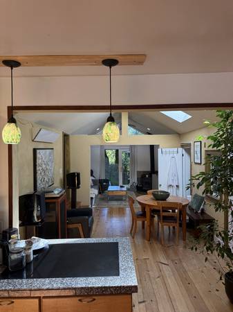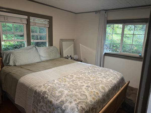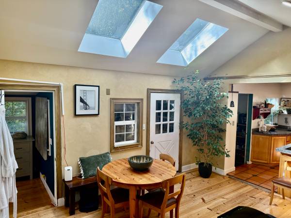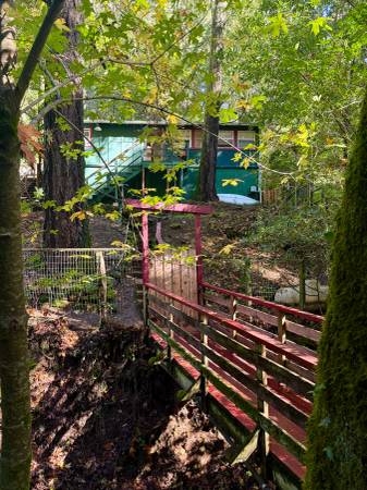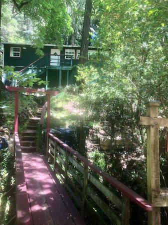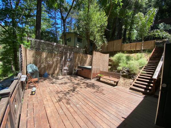 Bright, quiet home on a country lane in Forest Knolls, surrounded by redwoods and the sound of San Geronimo Creek. The house blends natural materials, rustic charm, and simple modern comforts, creating a calming living space in a wooded setting. Ideal for those who appreciate nature, gardening, or a peaceful lifestyle. Pets welcome.