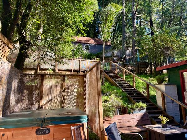 Cross a footbridge over Lagunitas Creek. There is also a separate studio unit on the property occupied by another tenant; both units maintain privacy with separate entrances and shared, optional pathways. The home and the studio are on different levels of the property, each with its own entrance. The half-acre lot offers plenty of space to enjoy the outdoors, including shared areas such as the main pathway and parts of the garden. It provides both privacy and the convenience of respectful cohabitation for those who value space, nature, and a thoughtfully shared environment.