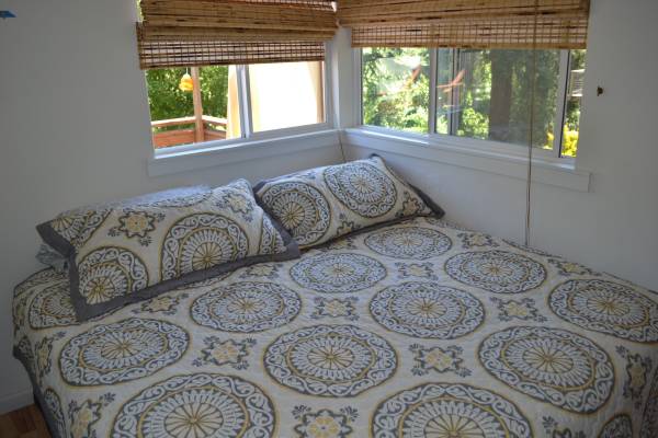 The house has views of the mountains on the other side of the river and you can even see vineyard fields. The yard (covering an entire acre) is large and perfect for entertaining and games with the river at the far end. There are huge legacy redwood trees on the property, as well as a fantastic rose garden with a path. Several fruit trees complete the nice country setting of the cottages.