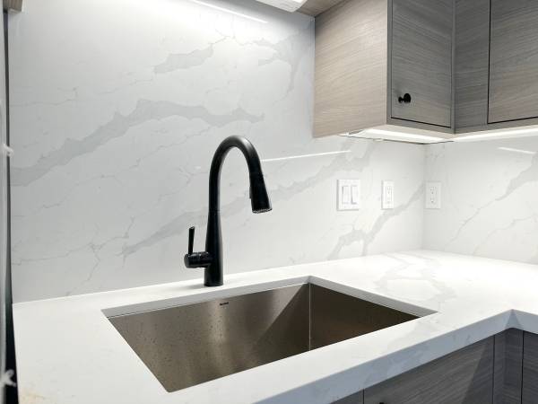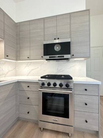 A sleek Modern Kitchen. Prepare meals with ease in the stylish kitchen featuring stainless steel appliances, contemporary cabinets with undermount lighting, stunning Quartz countertops, and a sleek backsplash.