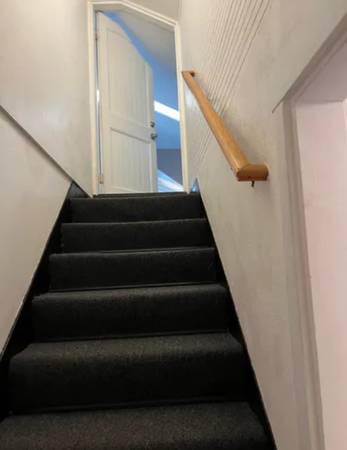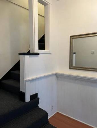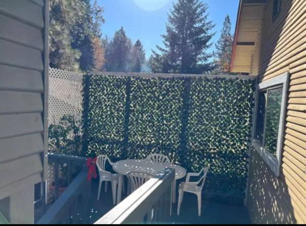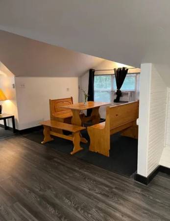 Nevada City upstairs loft (in 3 unit building) with approximately 800 square feet, living room with gas fireplace and skylight, kitchen with refrigerator, electric stove, microwave,, eat in bar with bar stools, window ac unit, walk in closet, storage, combo washer/dryer, desk and bookcase area. Shared deck and yard area. Walk to downtown Nevada City.