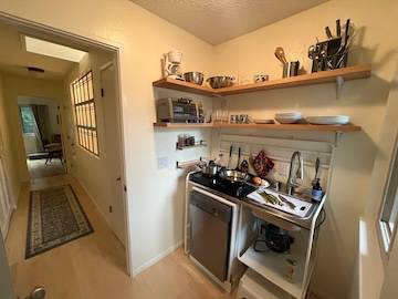 Completely remodeled in 2025 with hardwood floors, skylights and all new appliances. 3% discount if rental term paid in full. New kitchenette includes 11.5 cubic foot frig/freezer, D/W, garbage disposal, 2 burner induction cook top, air fryer/oven and microwave. dishes and cookware. In-unit washer and dryer. Living/dining room with closet, table, chairs.. Big master bedroom with queen size bed, chest of drawers, desk, side table and bookcase and credenza. Includes sheets, towels, and bedding. Close to major bus lines and Smart Train Onsite parking space in a private lot. Central heating and wall heater in living/dining room and baseboard heater in bedroom. Includes professional cleaning service Rent: $2200/mo Utilities: $125/month base for PG&E winter months) FAQs re excess usage), Dedicated frontier Internet, $50 a month Seeking mid-term renter (2-6 mo), profs only: nurses/doctors, academics, executives. Background and check credit checks . Renters insurance req.