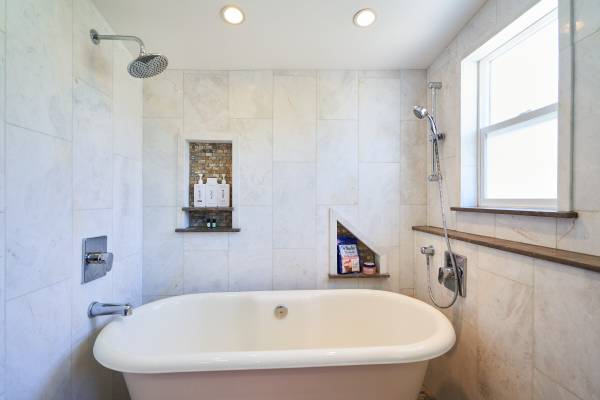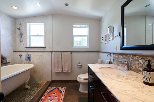 The bathroom has a claw foot soaking tub with two shower heads, a low-flush toilet with a bidet, as well as a double vanity, hotel-quality towels and soaking salts and hair products.