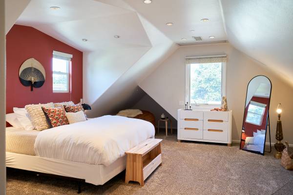 The bedroom is very roomy and has a King bed with a pillow topper for ultimate comfort, multiple closets and a large dresser. You'll also find a meditation corner in the room with a diffuser, pillows and a mat to lay down on.