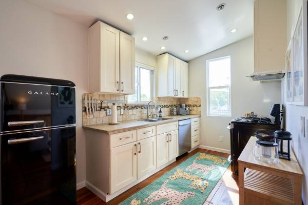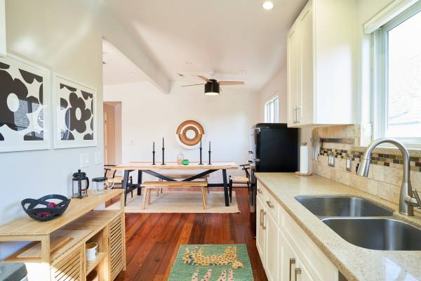 The dining area/kitchen has a huge farmhouse dining table, new fridge, new dishwasher, new ceiling fan, stove/oven and fully-stocked kitchen with pots/pans, utensils, cookware, plates, dishes, glasses, mugs, teapot, blender, electric kettle, etc. Essentially, you should have everything you need to feel right at home!