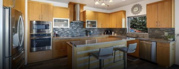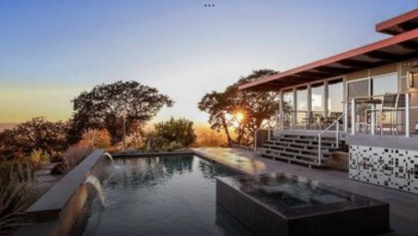 Living room has two floor-to-ceiling walls of glass overlooking the Petaluma Valley and the pool/hot tub patio area. The outside deck has built-in gas BBQ. Inside, there is also a dining area, modern kitchen with island and seating, (heated floors, fridge, microwave, cooktop, dishwasher, and oven); a wood burning fireplace and media alcove. Motorized shades keep the room shaded during sunny summer afternoons.