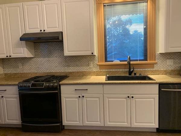 Light-filled, updated kitchen with granite countertop, black stainless steel appliances and plenty of cabinets