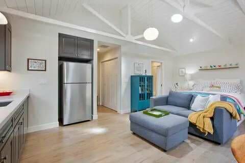 Newly remodeled Mother in Law Unit where garage used to be. Light and airy, high ceilings, bath with tub and shower. Kitchen is full service with new cabinets and new appliances. Full size closet and access to washer and dryer. Entry is on the side of the house behind fencing.