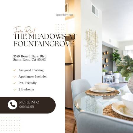 Now leasing at The Meadows at Fountaingrove, located in one of Santa Rosa’s most desirable neighborhoods. Rent: $2,800/month Deposit: $0.00 Term: Call for details Available: NOW Apartment Features:...