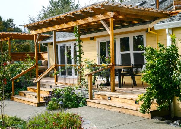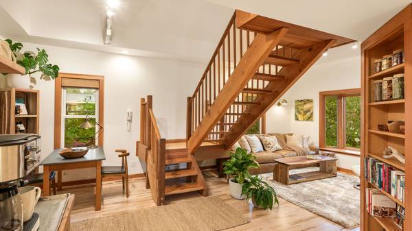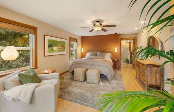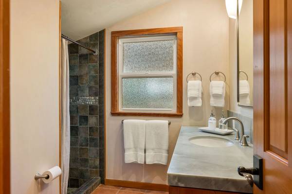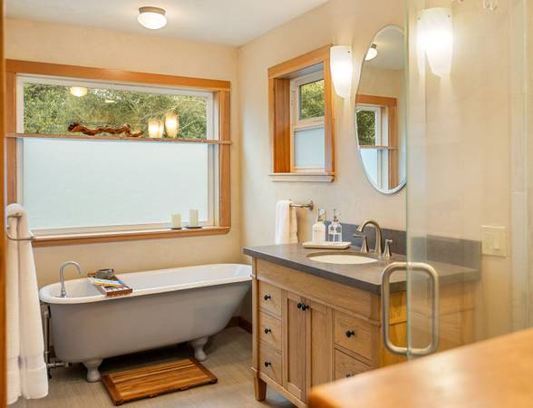 The spacious primary bedroom and sitting area, includes an ensuite bathroom with claw foot tub, separate shower. There is direct garden access and a luxuriously, huge and comfortable outdoor day bed and pergola dripping with flowers and greenery. The second bedroom is tranquil and nourishing, with a large bay window looking out to the garden highlighting the red Japanese maple. This bedroom has access to second garden deck with outdoor clawfoot tub with shower adjacent to the waterfall. This is the perfect setting for outdoor yoga or a peaceful rest where you can stretch out on a wide bench listening to the sounds of the garden. The third bedroom, upstairs is like a tree house with access to a covered roof deck overlooking over the garden and into the spectacular long distance views of surrounding landscape, especially delightful for morning and evening tea or coffee at the cafe table, or a quiet reading spot in the comfy chair. There are two twin beds in the cozy nook in this room, or, utilize as a closet. Beds are new and curated for superb sleep quality and comfort.