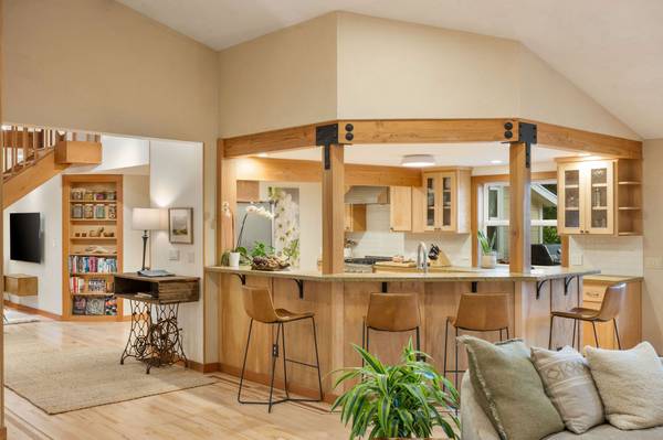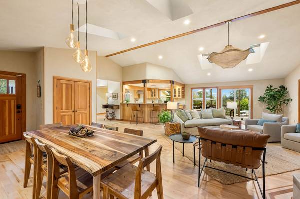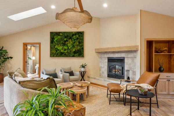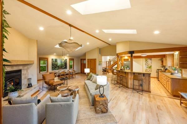 Interior highlights and ecological features include earth plaster walls, natural woods and finishes, high end sustainably harvested, artisan crafted furnishings, and real artwork by local artists. Solid maple hardwood floors throughout, custom red alder cabinets and concrete counters in the chef's kitchen with professional grade stainless steel appliances. The great room with wood burning fireplace is at the center of the home. There are skylights, windows and glass doors to the covered porch and outdoor dining area with large farm table, BBQ and food prep area.