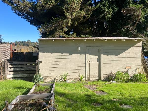 No garage but a separate building is available for storage. The last photo shows the exterior of the storage shed