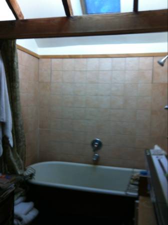 A palatial bathroom with a marble-topped wooden sink cabinet, tile floor, large cast iron claw-foot tub/shower with a vented skylight above the tub (in the vaulted ceiling), and a huge walk-in closet.