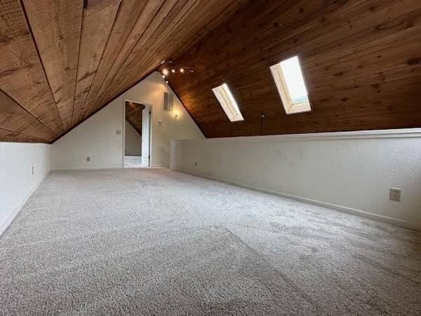 Great home in great location in great town. 3 bedrooms and 3 full baths. Two bedrooms downstairs, one with private bath. One bedroom upstairs with it's own bathroom and office or play area . Living room soars up to second story roof with skylights Detached garage for storage and two off-street parking spaces. Note: On ground floor, the home has some well-insulated wall adjoining another unit.