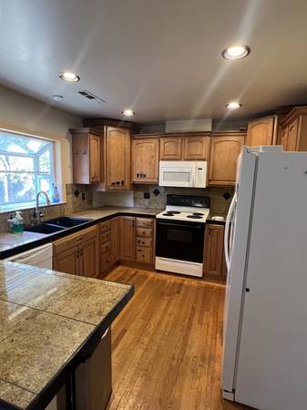 Spacious 4 bedroom, 2 bathroom house featuring a large living room with fireplace, updated kitchen, deck & yard, plus two car garage. Master bed with in-suit bath and closets in all 4 bedrooms. Washer/dryer located in the garage. There is parking available in the garage, two spots in front, and on the street in front of the house.