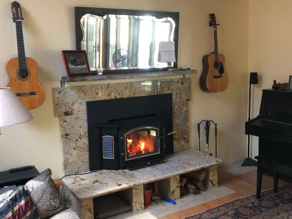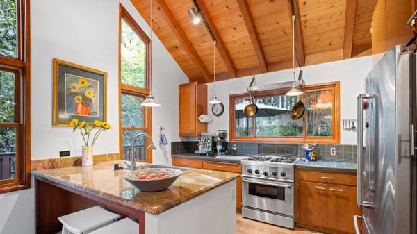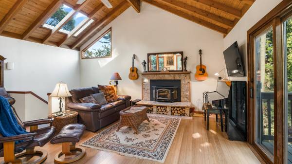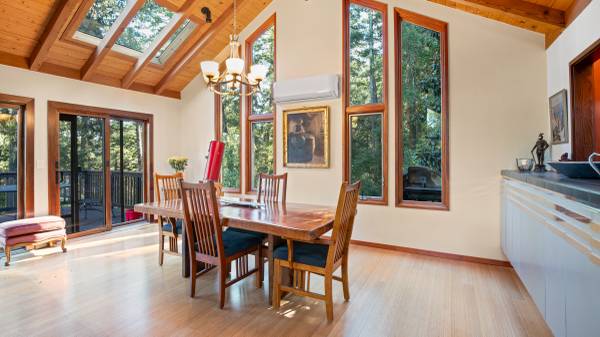Master bedroom’s sliding window door steps onto a hardwood deck with private jacuzzi deep in the forest. Master bathroom With Sauna for 4 people in comfort.