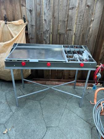 New flattop gas grill 2 burners underneath One side burner Very light Easy to transport Brand new Asking $200 Have 2 left Email with number if interested