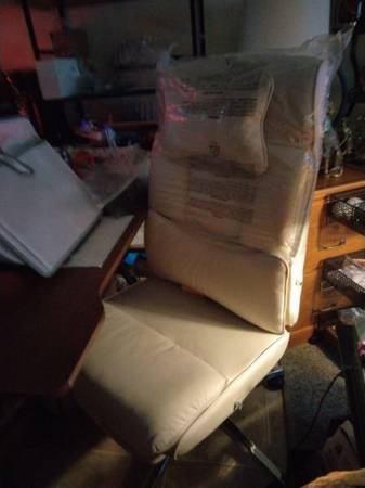 Beautiful cream color office chair with all the bells and whistles, heated massage foot extension padded arms that move ( arms not on in picture because it's too big for my desk). 5 star wheels and...