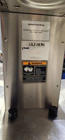 This is a used and refurbished older model thermal carafe coffee brewer, with a 3/8" OD QC push fit water inlet and 120V pigtail. Cleaned and descaled, has correct new spray head and brew cone. Comes with a clean used thermal carafe. Original label was mostly illegible but it's a 29000.0000, model year unknown. Tests good, no leaks or issues. Simple design and will last a lifetime. Has some surface scratches on roof and deck. Has printed manual and hot water spigot on the front. Can be wired for 120V or 240V, currently has 120V pigtail.
