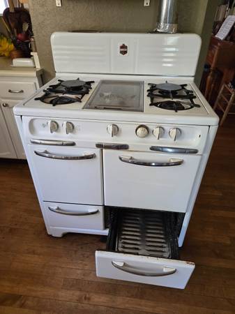 Getting rid of a vintage Wedgewood Stove in great condition. It was one of the reasons we bought our house 24 years ago, but we're going all-electric so the stove has to go. 4 Burners plus a center griddle. Single oven and broiler drawer. The left side is storage. Works like a charm.