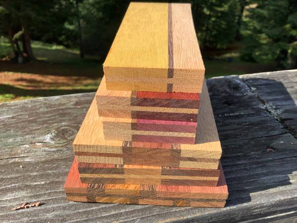 Exotic Hardwood triple layer Cut offs for woodwork art pens /purple yellow heart paduak wenge oak Glued with gorilla glue Located in occidental Cash