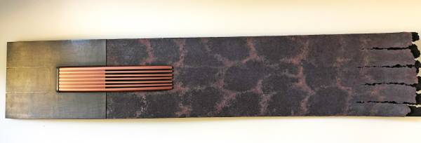 “This artwork is made with hand made paper lead and wood with acrylic paint. The paper is made with a mix of cotton fiber and abaca fiber. Abaca fiber comes from the banana leaf and gives the paper strength the cotton fiber gives the paper its texture. Making the paper pulp, I use natural pigment and polymer. The paper is made on a smooth table surface with a silicone release on the surface, the pulp is patted or spanked together then sponged to remove the water, it then dries for several days, the side that is face down on the table is the side that you see on the artwork. A wooden frame is made to fit the paper as well as the lead surface. The lead is glued to its surface and its soft edges are burnished together to create a surface that looks like solid metal. The paper is then glued to its surface and the detail of the grill made from wood with acrylic paint is then added.”