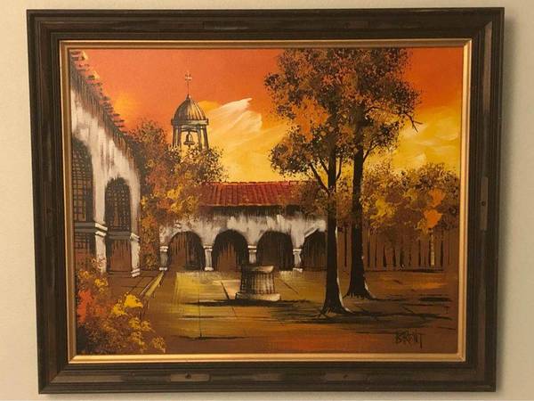 Vibrant original acrylic oil painting by Brent. Courtyard, mission scene with bell and cross in the background in orange, yellow, red… 35” x 29” Cash or Venmo Please click on "More Ads by this User"...