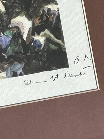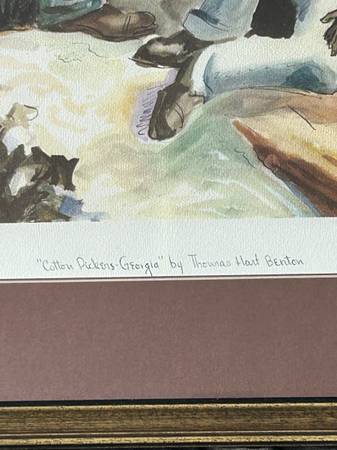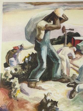 Vintage 1938 color lithograph reproduction of Thomas Hart Benton’s 1931 original watercolor, ink, and graphite painting called Cotton Pickers. In the 1930s Associated American Artists reproduced this watercolor as a gelatone print entitled Cotton Pickers: Georgia.