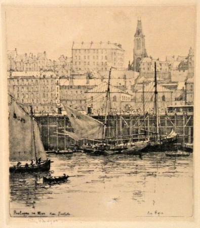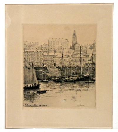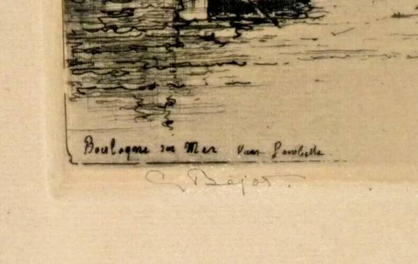 "Boulogne Sur Mer" Signed Etching by French Artist Eugene Bejot - circa 1920. (6 x 7 inch etching) Good Condition - tanning