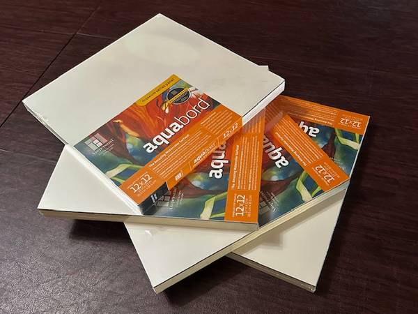 Ampersand Art Supply Watercolor Painting Panel: Museum Series AQUABORD, 12" x 12" x 7/8” Flat Profile is brand-new, in original shrink-wrap packaging. The panel has acid-free clay and mineral ground on warp-resistant Hardboard w/ highly-absorbent watercolor surface, similar in texture to cold-pressed watercolor paper. The AQUABORD will not tear, shrink or buckle even under heavy water application, and it requires no stretching or mounting. An over-purchase, these retail on-line for over $30 ea. I have several panels, all new, bargain-priced here; and even better, a 10 percent discount with purchase of all four (4) panels. One or all are available for local pick-up in San Rafael, cash, Venmo, or PayPal.