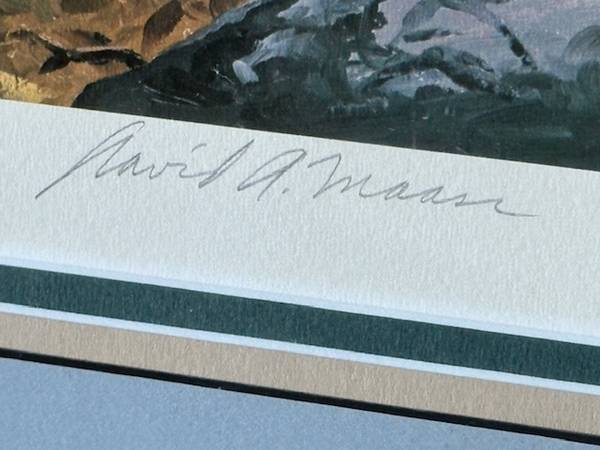 Framed David A. Maass (b. 1929 ) Offset Lithograph ‘Ridgeline - Ruffed Grouse and Branches’ was issued by Wild Wings, Inc. in 1974. This is a Signed and Numbered Limited Edition Print #551/580. The artist’s signature in pencil is in the lower right of the bottom margin, numbered on the opposite side of the same margin. The publisher’s statement is centered in the upper margin. The image is about 25” W x 15-1/2” H, with triple beveled mats under glass, about 32” W x 23” H. Overall, the wood frame is 35” W x 26” H. The frame has a few scuffs and nicks but is generally in very good condition for its age. The back is dust-sealed w/brown Kraft paper and wired for immediate hanging. Similar signed offset lithographic prints retail on-line for about $600, unframed. This is bargain-priced, framed and ready to hang, available for local pick-up in San Rafael, cash, Venmo, or PayPal.