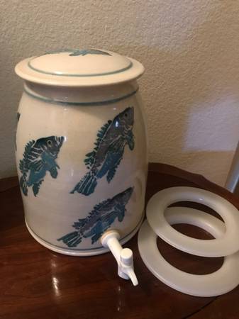 Beautiful 9 quarts ( 2 gallons plus 1 qt) ceramic hand-painted ceramic decanter/ beverage dispenser. Made by Hendry Pottery in Santa Barbara, one owner bought new. No damage at all. Comes with ceramic lid and 2 plastic rings for putting on 5 gallon container. Push spout for easy self serving. Original art piece.