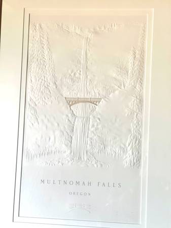 75th Anniversary Multnomah Falls ‘Benson Bridge’ (erected 1914) Commemorative Embossed Paper Print was issued in 1989. This print is professionally framed, double-matted under glass. The Falls is a tributary to the Columbia River Gorge on Oregon’s northern boundary. Local Portland OR artist Becky Gyes designed the print, which was professionally engraved without lines, without ink, on pure white Arches 100 percent rag printmaking stock imported from France. As such, the image is the artist’s impression of the oft-occurring winter phenomenon of bitter cold Oregon high-desert winds swirling down the Gorge and encapsulating the falls and surrounding trees in ice and snow, effecting a white winterscape. The print is pencil-signed and numbered (here concealed by the overmat.) The double-matted opening is about 11” W x 19" H; anodized ‘champagne’ aluminum frame is about 17-1/2” W x 25-1/2” H", wired, ready-to-hang. It’s available for local pick-up in San Rafael, with cash, Venmo, or PayPal.