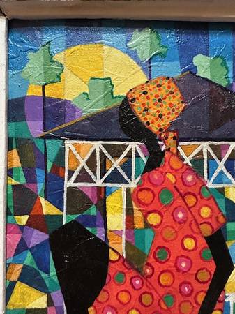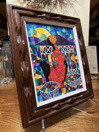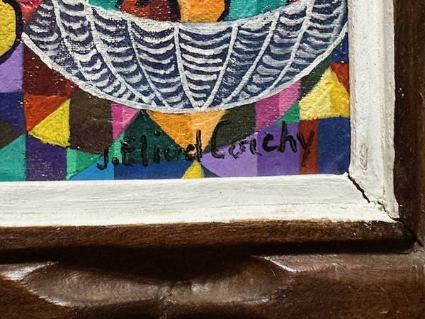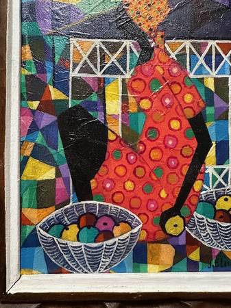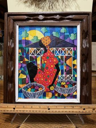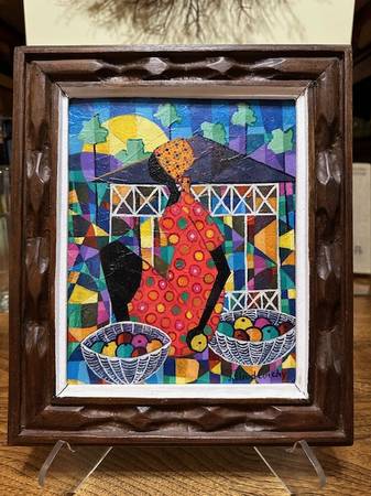 Original Acrylic Painting 8”x10” by Haitian Artist Jean Eliud Coachy, signed on the lower center of the artpiece ‘J. Eliud Coachy.’ This is indigenous folk art of Haiti ca. 1970s-1980s, acrylic on canvas over wood stretchers nominally 8” W x 10” H, mounted in contemporary Haitian carved wood frame, nominally 10” W x 12” H. Coachy's Cubist Abstract, Surreal and impressionism have earned him the reputation of one the leading artist of Haiti. His works are primarily in acrylic on canvas and gouache. This is one of the pieces referenced on the original bill of sale dated 1982 from the National Art Gallery, Petion-Ville, Haiti. It’s a colorful depiction of a woman vendor w/two baskets of fruit set against a simple tent structure against a colorful patchwork quilt-like background, and a skyline w/rising sun. It’s available for local pick-up in San Rafael, cash, Venmo, or PayPal.