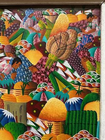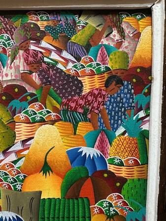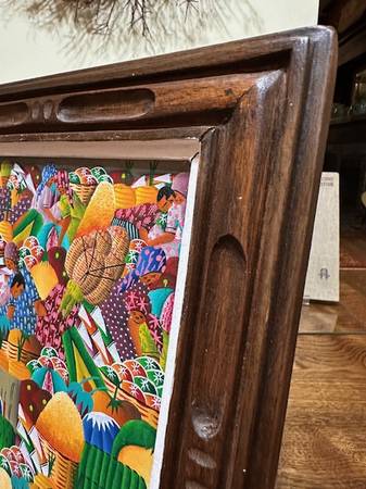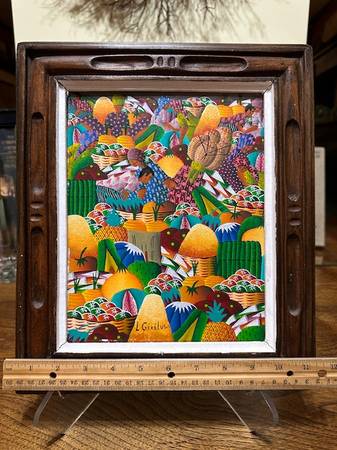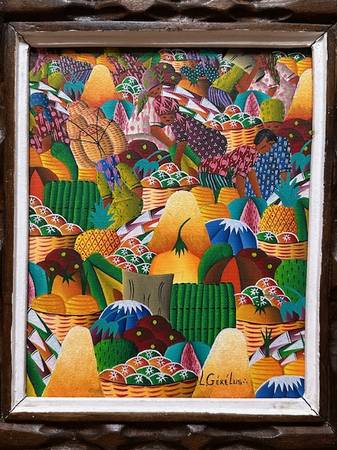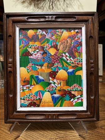 2 ea. Original Acrylic Paintings 8”x10” are by Haitian Artist Leon Gérélus, each signed on the lower center of the artpiece ‘L. Gérélus.’ These are indigenous folk art of Haiti ca. 1970s-1980s, acrylic on canvas over wood stretchers nominally 8” W x 10” H, mounted in contemporary Haitian carved wood frames, nominally 10” W x 12” H. These pieces are referenced on original bills of sale dated 1982 from the National Art Gallery, Petion-Ville, Haiti. They were identified on the bills as Nos. 120 and 121, as marked in pen on the back of each stretcher frame. They are similar in subject, a Haitian outdoor market, each from slightly different perspectives. Both have mounds and baskets of market goods, with people in the middle- and background. All create a rainbow of abstract colors, a tapestry of Haitian life in the late 20th century. (Gérélus’s work is cited in a thesis by Eva Pataki ‘Haitian Painting, Art and Kitsch’ published in 1986. In it she provides a list of 2,000 Haitian painters, including Leon Gérélus on Page 33, and about 200 black and white illustrations of some of those artists’ work.) Listing price is for one (1) painting, with a modest discount for purchase of the pair. One or both are available for local pick-up in San Rafael, cash, Venmo, or PayPal.