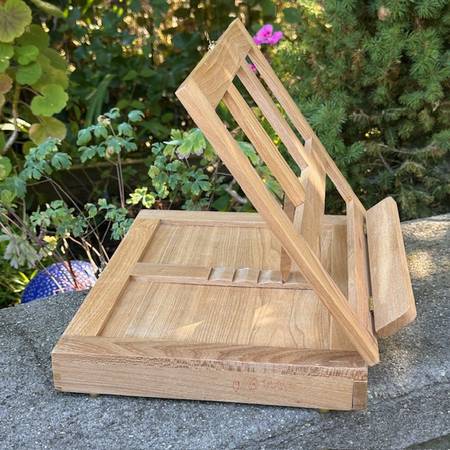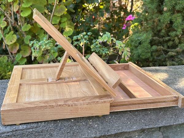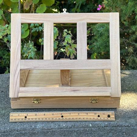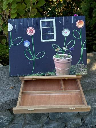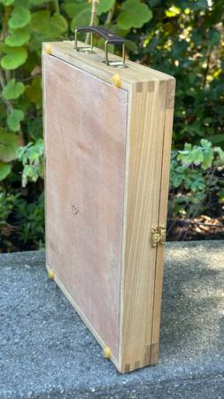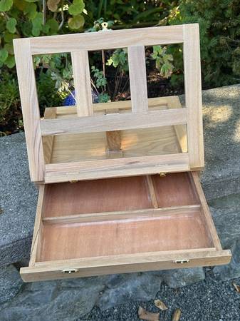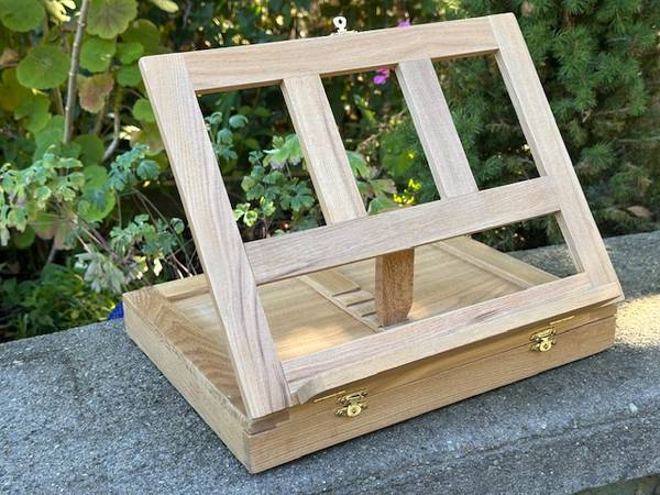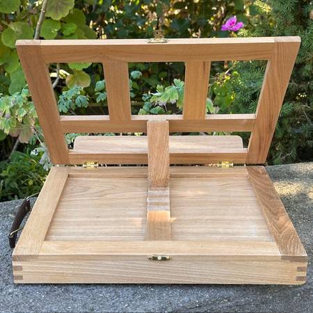 Brand-new Portable Tabletop Studio Easel Box w/Storage Drawer but without retail packaging. It is made primarily of Beechwood It’s a French-style easel w/adjustable support backing and clasp-locked interior storage drawer. It has locking clasps and faux leather handle to ensure its portability. Its removable drawer is about 3/4” D and has three fixed storage compartments. The easel back can be inclined to four preset angles. In its closed and locked configuration, the box is about 13” L x 10” W x 2” D and weighs about 3 lbs. The easel can accommodate art board and canvas of up to 12” x 14.” (It can even serve as a book stand for hands-free reading.) It’s a great tool for the for plein-air painter on-the-go, and available for local pick-up in San Rafael, cash, Venmo, or PayPal.