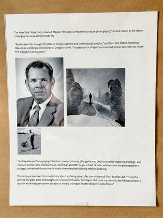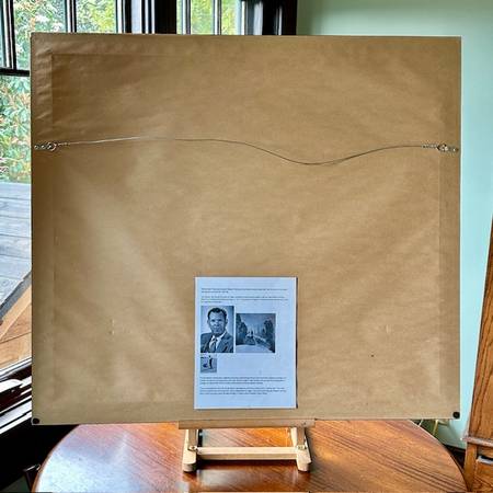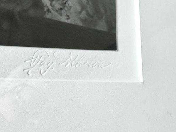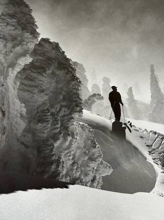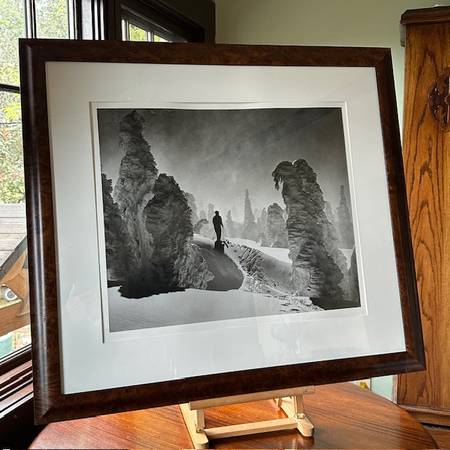 Framed Silver Gelatin Photo 7430 ‘Playground of the Wind’ by Ray Atkeson (1907-1990) has Atkeson’s stylus-impressed signature in the lower right corner of the print image margin. Atkeson was the preeminent photographer of the Northwestern U.S. landscape beginning in the 1930s. He became especially well-known for his stunning black & white images of the ski and snow country in the Western states. Atkeson's photographs often appear alongside his peers Ansel Adams, Edward Weston, and others, including Adams’s book ‘This is the American Earth’ (1960.) In 1990, the New York Times wrote that Atkeson was ‘Considered the dean of Northwest nature photography.’ This is an original silver gelatin photograph ‘Playground of the Wind’ that can be found in The Ray Atkeson Image Archive, 7430. [According to a source in The Oregon Historical Society, his wife Mira Atkeson, who often accompanied him on photography trips, may have made the photograph of him on skis in a snowy landscape, likely under his direction and hence his signature on the image.] The photograph was printed from the original negative on gelatin silver paper. The blind stamp on the front of the print was chosen to identify prints made from the original negative after his death. This image is 23-1/2” W x 19-1/2” H including print margin. It is hinge-mounted on a 2-ply backer board (not dry-mounted) with a white, beveled 4-ply overmat opening of 24-1/2” W x 21-1/2” H; the overall mat size 32-1/2” W x 29” H, all materials archival. It is overlain with glass and wood-framed, nominally 35-1/2” W x 32” H, with foamcore backer and dust-sealed w/kraft paper. It is strung with wire, ready to hang. The framed photograph is available for local pick-up in San Rafael, cash, Venmo, or PayPal.