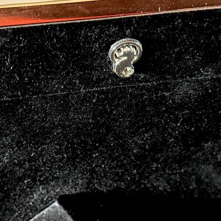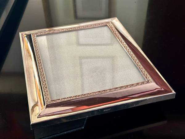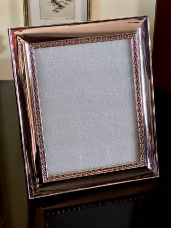 Used but well-kept, this Reed & Barton/Waterford ‘Powerscourt’ Silver-Plated Photo Frame is a classic design, perfect for a special 8” x 10” photograph. The frame is silverplate w/gold-accent chain pattern on its interior edge. It is specially treated to resist tarnish. Glass-faced, it is rear-mount w/black felt-faced back and hinged foot for tabletop presentation. The latter allows for both vertical and horizontal placement. The silver-plated metal ‘seahorse’ is fixed to the back-of-frame, and the Waterford logo is imprinted on the bottom edge of the frame. Overall, the frame is 10-1/4” W x 12-1/4” H x 1” D. It has a few subtle scuffs, but these are outshone by its silver gleam. New, comparable silverplate Reed & Barton or Waterford frames retail on-line for about $100, bargain here. It’s available for local pick-up in San Rafael, cash, Venmo, or PayPal.