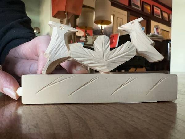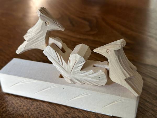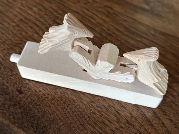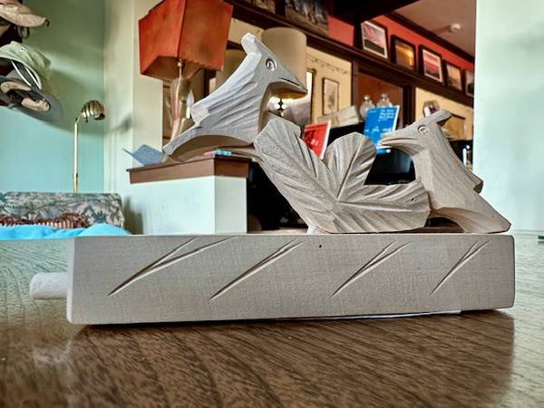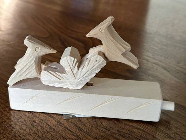 Russian Carved Wooden Folk Art Toy Dualling Birds w/Pushbutton Action beautifully hand-carved c. 1990s. The vintage toy appears virtually new, the wood in pristine condition, in perfect working order, the birds, possibly a Seller’s Jay, vey for worms, each alternating in pecking action w/each push of the button. Each bird is individually carved and mounted on base wood block the houses the pushbutton mechanism. It’s about 5” L x 2” W; the birds about 2” H, carved w/fine details. It has a Russian hallmark stamped on the underside, as well as a paper label affixed thereto, as well. Its unique design, attention to detail and action make it a valuable addition to vintage toy collection. It’s available for local pick-up in San Rafael, cash, Venmo, or PayPal.
