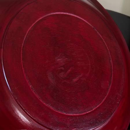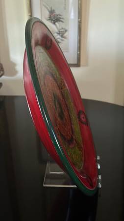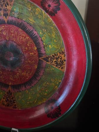 Vintage Decorative Hand-painted Wooden Plate is from in-law’s estate. It is 15”-dia. x 2” H, with 9”-dia. base. It is predominantly in reds and greens, with yellow/ochre triangles intersecting a series of ornamental flourishes, repeating on series of painted roundels, culminating in a central floral element. There are a couple of indents on the face of the plate that are imperceptible except on nose-close inspection; none break the paint surface. The underside of the plate is rendered in a red aniline dye-type finish that allows the wood grain to shoe through. The plate has no is maker’s mark, lending itself to the folk-art category, an ideal wall- or room-décor piece. It’s available for local pick-up in San Rafael, cash, Venmo, or PayPal.