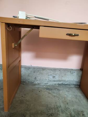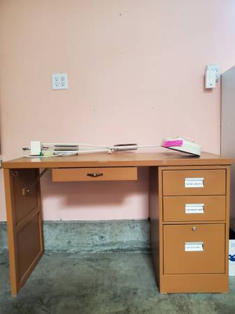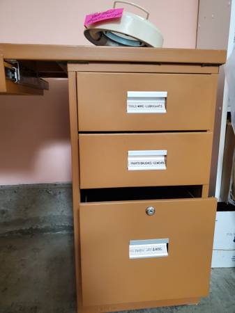 Great for Arts, Crafts, Projects, Model Kits with small pieces. The right side is a metal file cabinet. The left side and top are wood with a hinge to fold, that has a framed top that fits over the file cabinet. Key included. Measures 4' wide x 30" high x 20" deep.