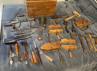 VINTAGE WOODWORKING TOOLS & TNT BOX $250 TOOLS INCLUDED WITH PRICE COMPS... ($844) individual comps for pricing available on request. ANTIQUE HERCULES HIGH EXPLOSIVES POWDER FINGER JOINT WOOD...