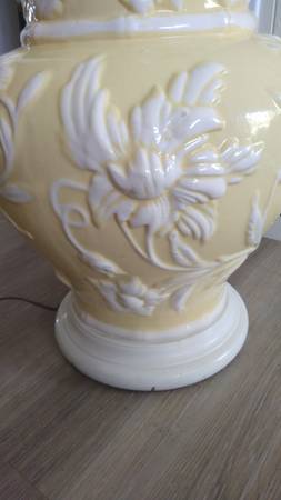 COTTAGE CORE CHIC CERAMIC RELIEF TABLE LAMP ~ Shabby Yellow&Floral Works, but wiring should be replaced Ceramic Base measures (approximately): 17" tall x 13" diameter We were going to repurpose...