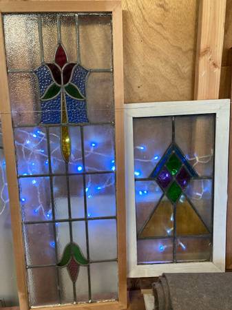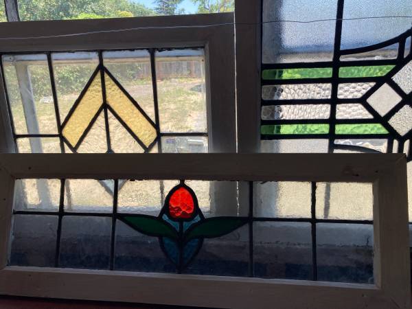 30 pieces of restored and custom-framed leaded glass. Various sizes: prices range from $60-$300 depending on size and uniqueness. Also have framed glass available in pairs or sets of four.