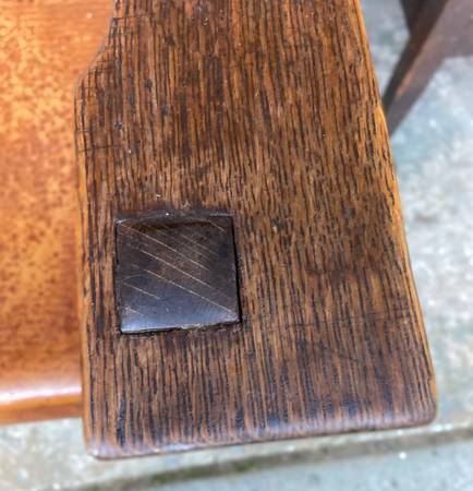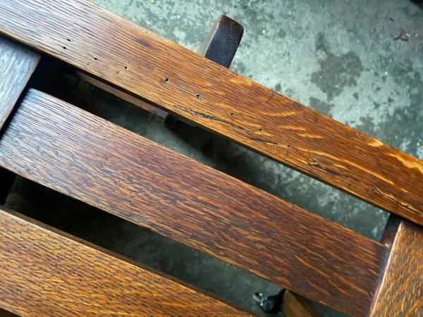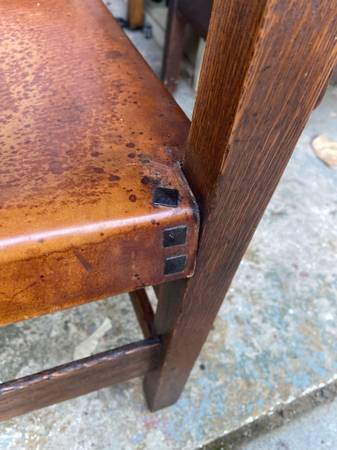 Handsome old chair that appears to have an older or original seat with tacks. Finish has been cleaned up with some color added and waxed. Chair frame is a bit loose but it's fully usable. The...