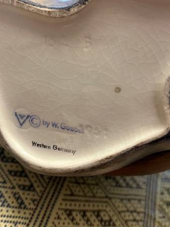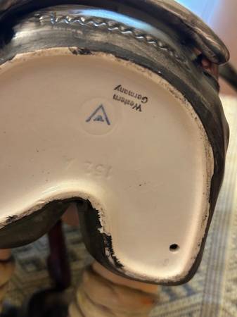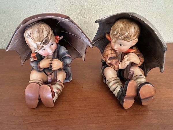 Vintage Hummel ceramic figurines marked Western Germany - Umbrella Boy & Umbrella Girl. Each is about 8 in. high to top of umbrella. Small repair on umbrella handle of Umbrella Girl. These were...